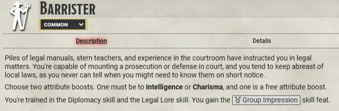 Barrister: Allows for 'Group Impression'. This will be a focus as we travel between settlements.