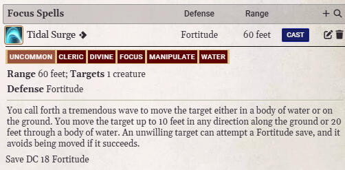 Tidal Surge: Focus spell from Cloistered Cleric. Can push individuals far distances using water. Disgusting in sea combat.